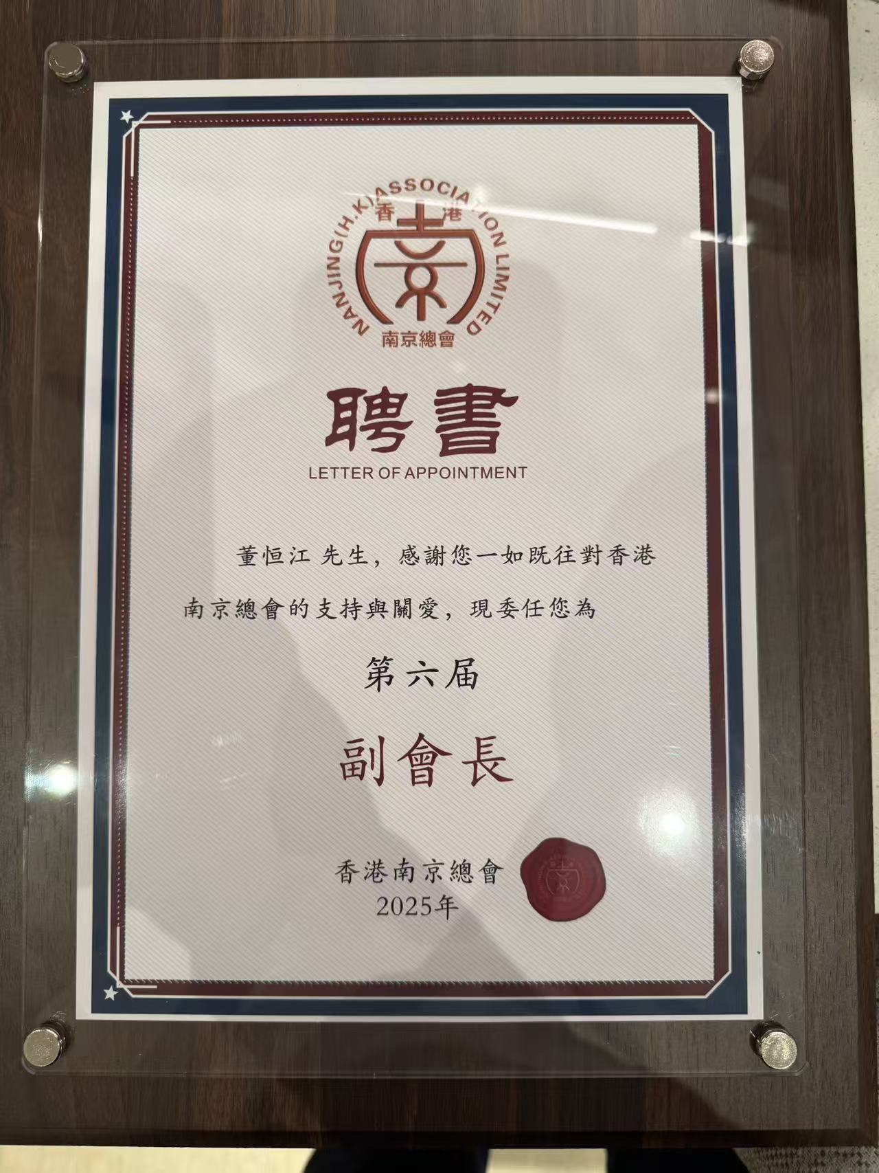 会上,董恒江先生当选为香港南京总会第六届副会长。作为文化创新与非遗传承领域的代表人物,董先生长期推动南京与香港两地在文化创意、青年创新创业等方面的合作,为促进两地交流作出了积极贡献。