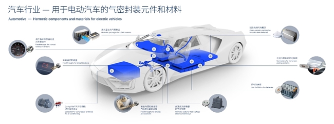 图示: 一辆新能源汽车中可能有30多个零部件都使用了肖特的特种材料 | |