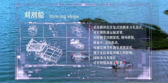 这种新型刈割船创新应用可拆卸、可调深、自动集草、多刀头等设计,运输安装方便,机动灵活。可以适应不同环境并快速部署,实时调整深度,精准切断互花米草根茎,既保证了安全又提高了效率。