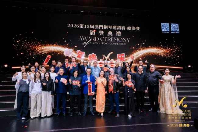 “2026,马年吉祥!”2026第十五届澳门钢琴邀请赛总决赛颁奖典礼现场,来自北京、广州、武汉、澳门等地,以及美国、英国、荷兰、奥地利、德国、意大利等国家的十五位钢琴教授、教育家,携手为现场嘉宾、选手及各界朋友送上诚挚的马年祝福,为这场音乐盛会增添了浓厚的节日暖意。