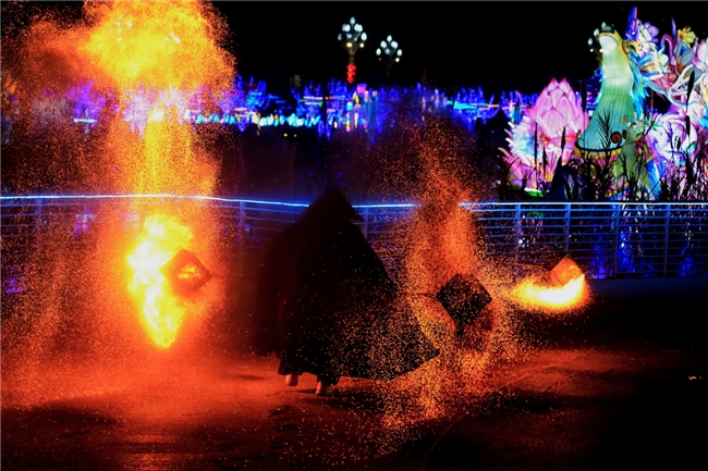 不止于单一非遗元素的复刻,达州灯会以彩灯为核心,串联起多个巴渠非遗。达州福善乡桐油纸扇、川东土家族薅草锣鼓等非遗成为灯组元素,非遗绝活打铁花在现场轮番上演,五大巴賨主题灯景、两大沉浸式演艺舞台,让灯会成为一场集非遗展示、民俗体验、美食休闲于一体的文化盛宴。
